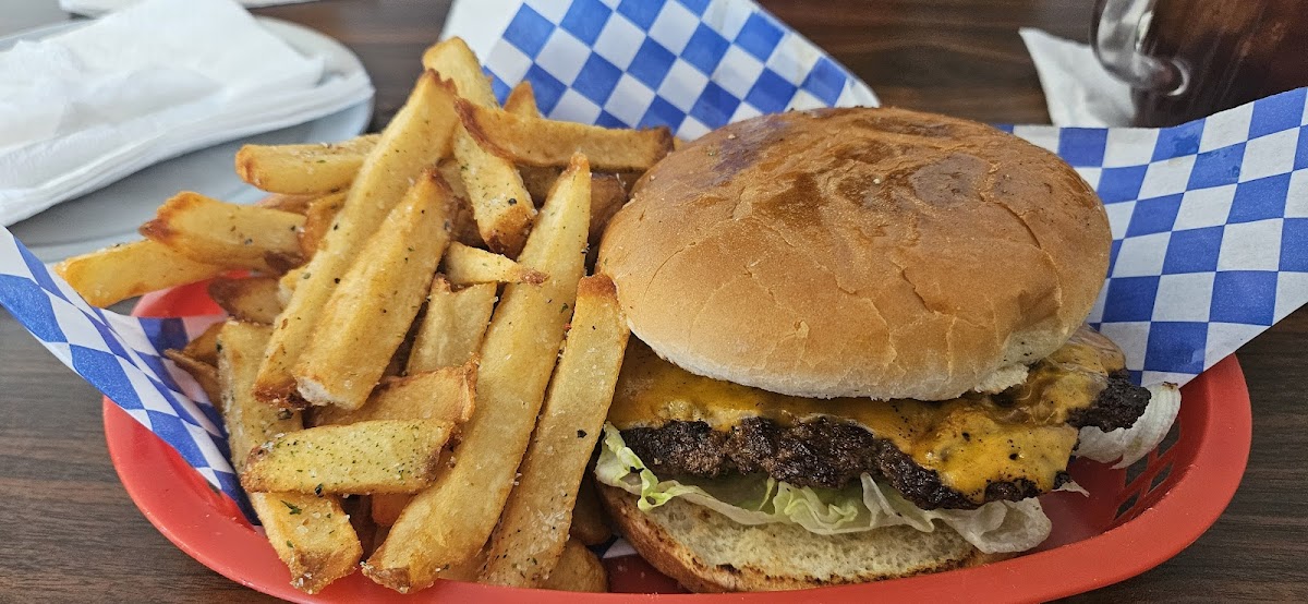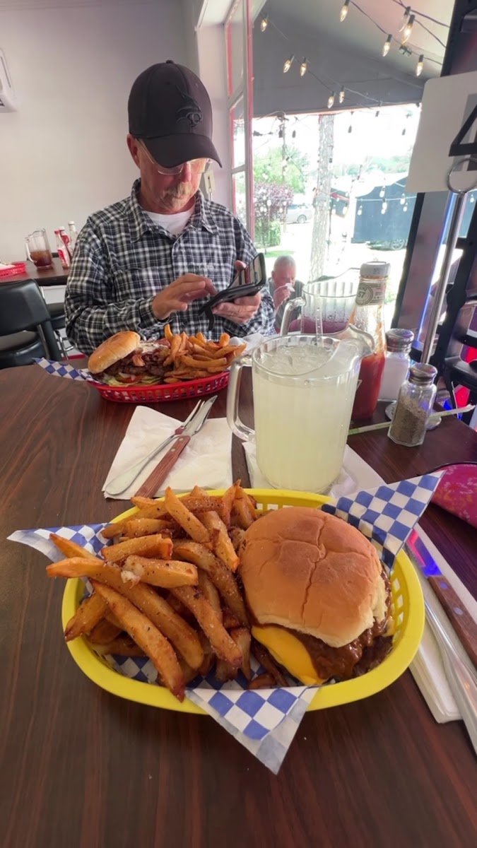 Nice little restaurant with a cute outdoor eating area! Great atmosphere inside & out. Friendly staff! Love the big drinks that come in small pitchers. Lemonade & Koolaid! My chili cheeseburger with bbq sauce was so tasty. Meat seasoned well. The fries are SO GOOD! Good portions for the price. Wish the chili was homemade but burger was still good.