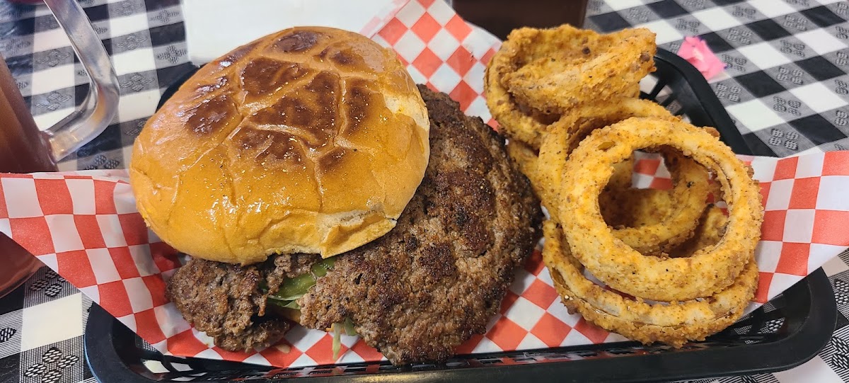 The burgers were deliciously juicy! They make them when you order them. So make sure your patient. It's wirth the wait. Onion Rings were great. Waitress was so sweet. I loved that their drinks are served in mini pitchers. And, they offer Kool-aid as one of your drinks! How cool is that! I couldn't even finish half of one. That's how big they are.